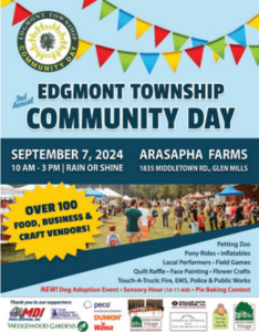 The mission of the Edgmont Township Community Day is to bring together the community, businesses, township staff and government officials and foster a deeper sense of community, pride, optimism, positivity, and inclusiveness within Edgmont Township.