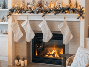 - Garland and Stockings: Drape a lush festive garland along the mantel and hang stockings from it or from decorative hooks.